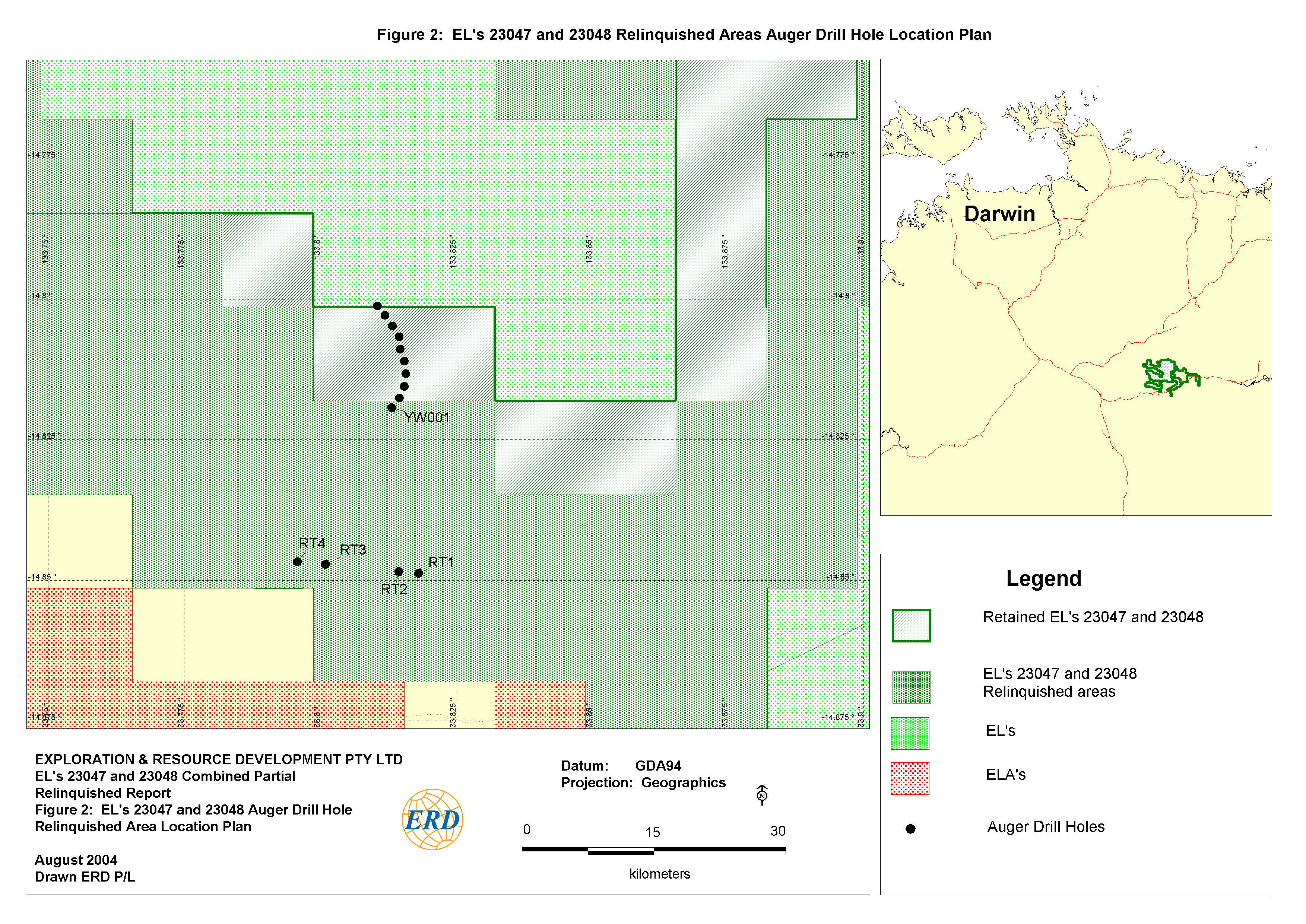 | Abstract: | Exploration Licences 23047 and 23048 were granted to Exploration & Resource Development Pty Ltd (ERD) on the 2nd December 2002. ERD Pty Ltd, a Darwin based resource sector company, is the designated Project Manager. The two contiguous tenements covered approximately 1,561 sq km (499 sub-blocks) in the southern portion of Urapunga 1:250,000 map sheet. Following rationalisation of tenure holding, a statutory 50% reduction of 190 sub-blocks (EL 23048) and 60 sub-blocks (EL 23047) was made at the end of year 2 (1st December 2004). The relinquished portions of EL 23047 and 23048 cover approximately 782 sq km of parts of largely concealed Roper Group stratigraphy in the Bauhinia Shelf tectonic element of the western McArthur Basin. The area was considered to have potential for detrital heavy mineral accumulations. Exploration activities within the relinquished portions incorporated office studies, helicopter supported field reconnaissance and drilling of five auger holes for a cumulative 30.4m. EL 23047 - The relinquished area largely straddles the Roper River floodplain. Published mapping and field inspections reveal a dominance of undifferentiated alluvium, colluvium, gravels and sands together with mud-rich floodplain sediments. Subordinate outcrops of quartz sandstone of the Hodgson and Bessie Creek Sandstone and ferruginous siltstones and fine- grained sandstones of the Munji Member of the Corcoran Formation (Roper Group) are mapped in the eastern sector. No ground intrusive activities were conducted on relinquished portions of EL 23047. EL 23048 - The tenement largely incorporates Kyalla Formation mudstones and siltstones and alluvial floodplains of the Roper River, Maiwok Creek and Flying Fox Creek in the central- northern area and arenites of the Moroak Sandstone and lutites of the Velkerri Formation in the western sector. Reconnaissance auger drilling (5 holes; 30.4m) was undertaken along a fence line north of the Roper River and on a station track east to north-east of Mt Patterson to test for indications of alluvial HM. Thick (>10m) pughy clay was encountered in the 4 holes north of the Roper River with trace visible HM. Low tenor results (0.1% HM) report from the fifth hole from clayey gravels overlying sandstones and siltstones at 4m depth. Potential for a palaeochannel alluvial play is considered remote. |